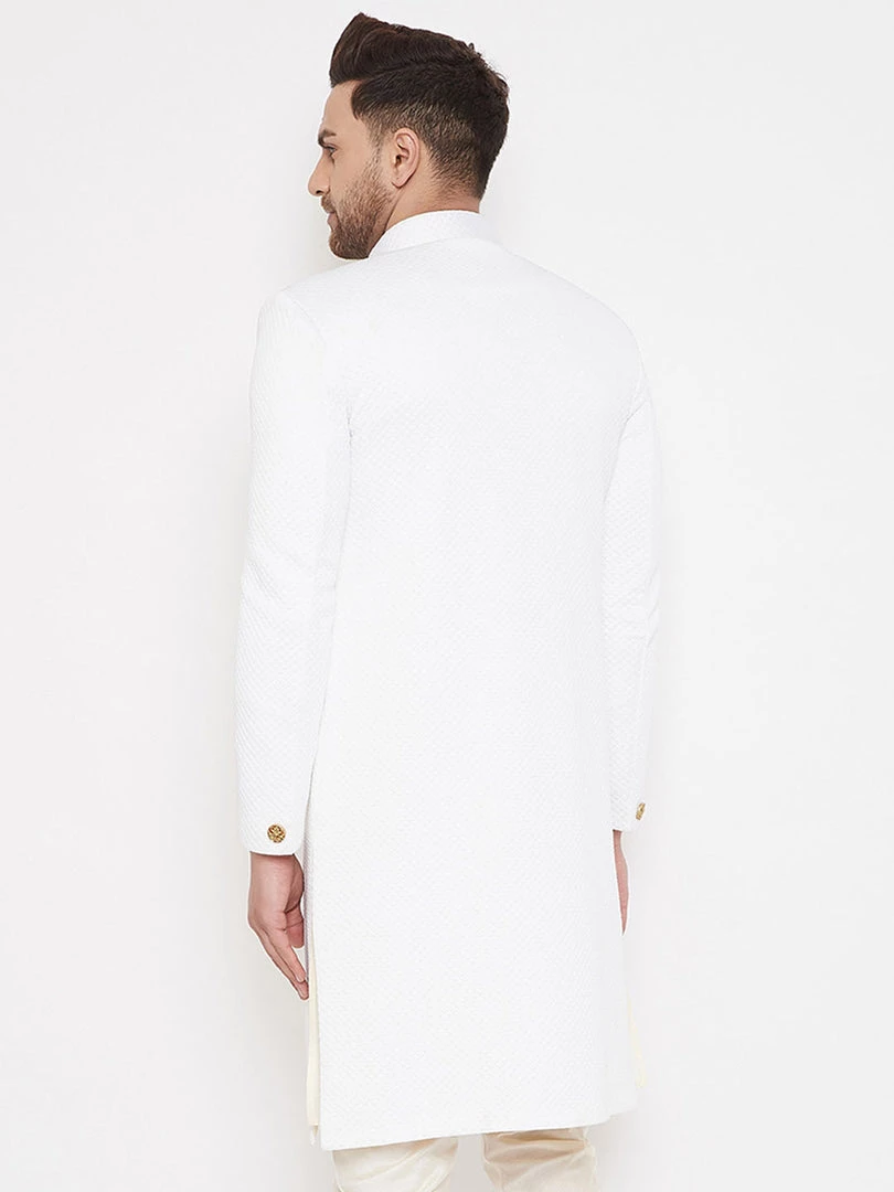 White solid Sherwani, has a mandarin collar, long sleeves, full front button placket, straight hem and a welt pocket. Comes with pocket square.