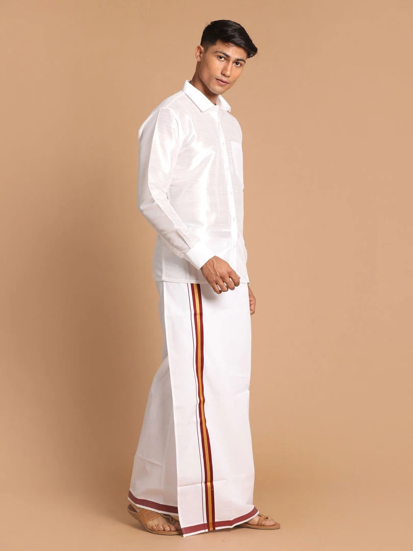 Vastramay brings to you this stylish South Indian style ethnic half sleeves shirt and ready-to-wear mundu vesty style dhoti pant set for. These are perfect relaxed shirts for any occasion including Festivals, ceremonies, Weddings, and Birthday parties. Popularly worn in South India on Vesty Mundu Dhoti along with an Angavastram.
