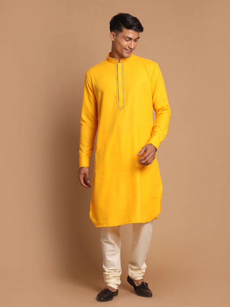 Men’s yellow cotton blend, straight, knee-length kurta, has a mandarin collar, straight hem, and side slits. Embroidery detailing on neck and placket.