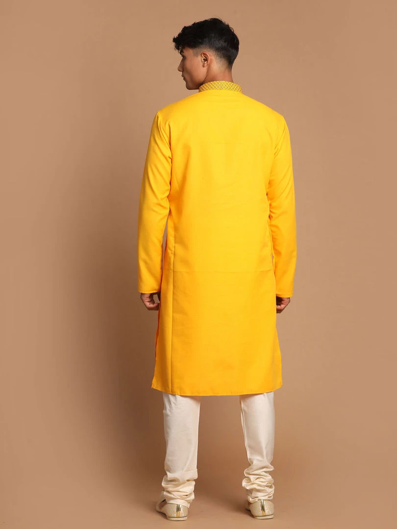 Men’s yellow solid, straight, knee-length kurta, has a mandarin collar, straight hem, and side slits. Detailing on neck and placket.