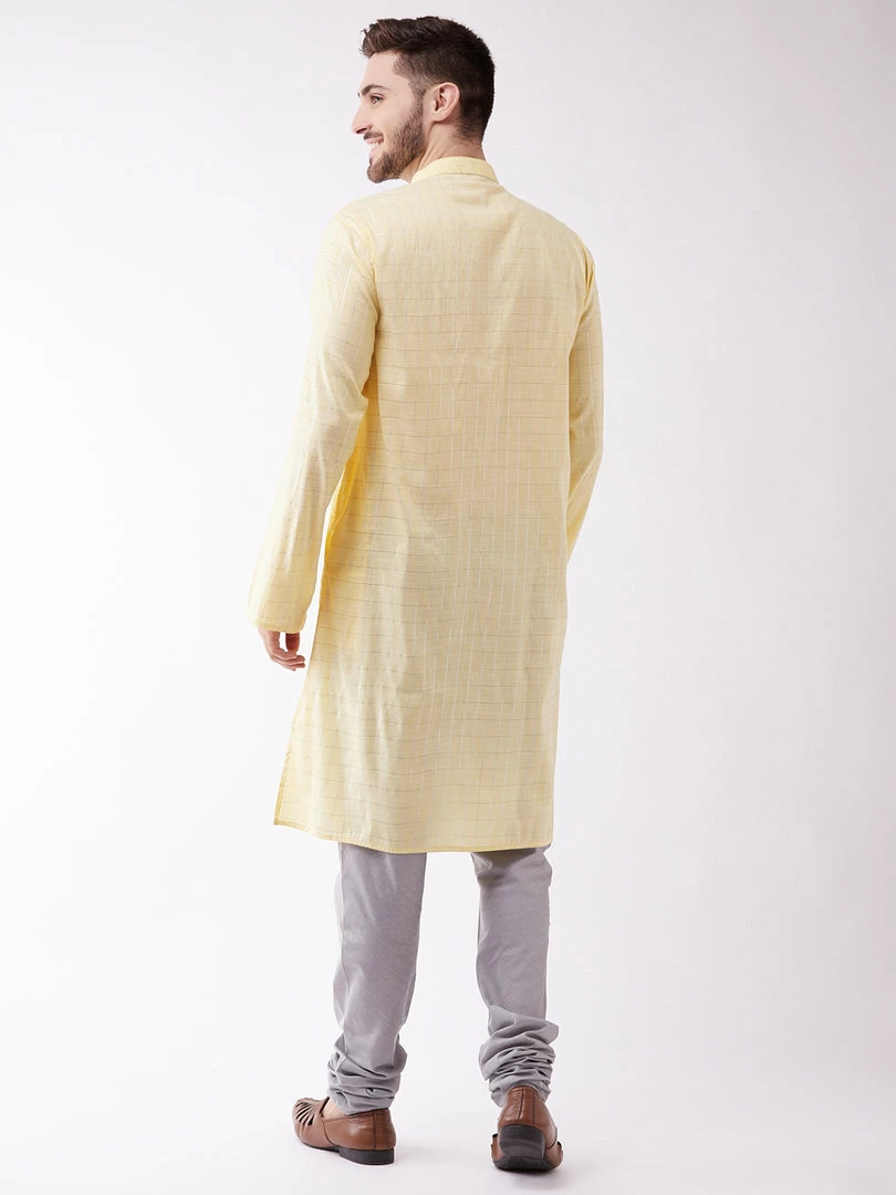 Yellow cotton blend woven straight knee-length kurta, has a mandarin collar, button placket, long sleeves, straight hem, and side slits. Comes with a grey solid churidar, has a drawstring closure.