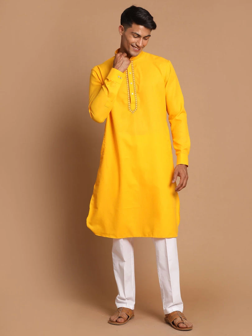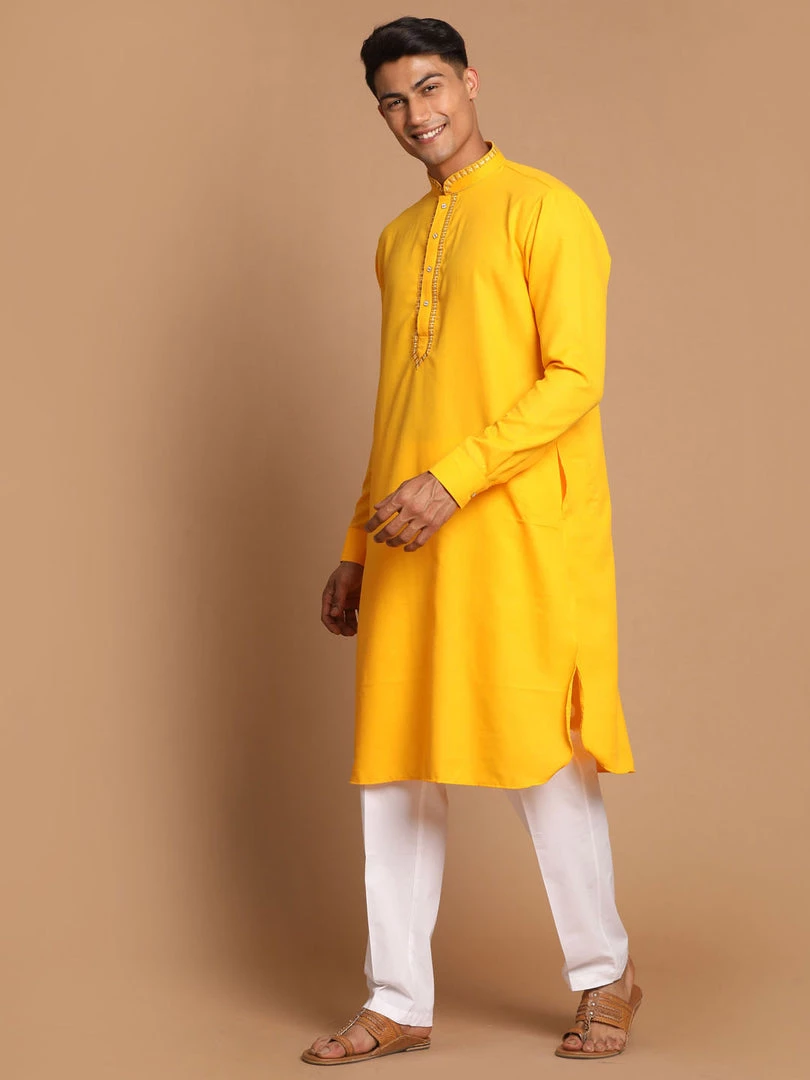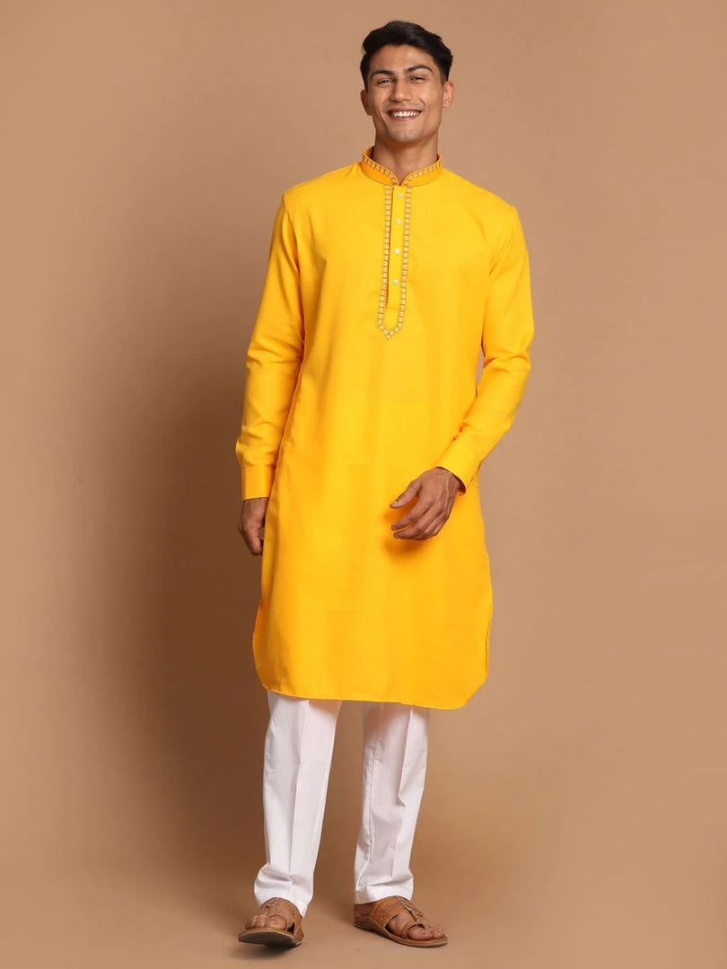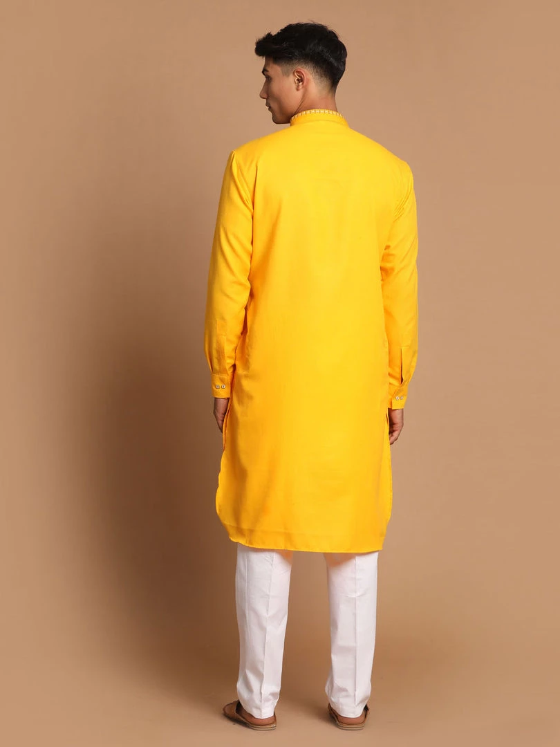 Men’s yellow cotton blend, straight, knee-length kurta, has a mandarin collar, straight hem, and side slits. Embroidery detailing on neck and placket.