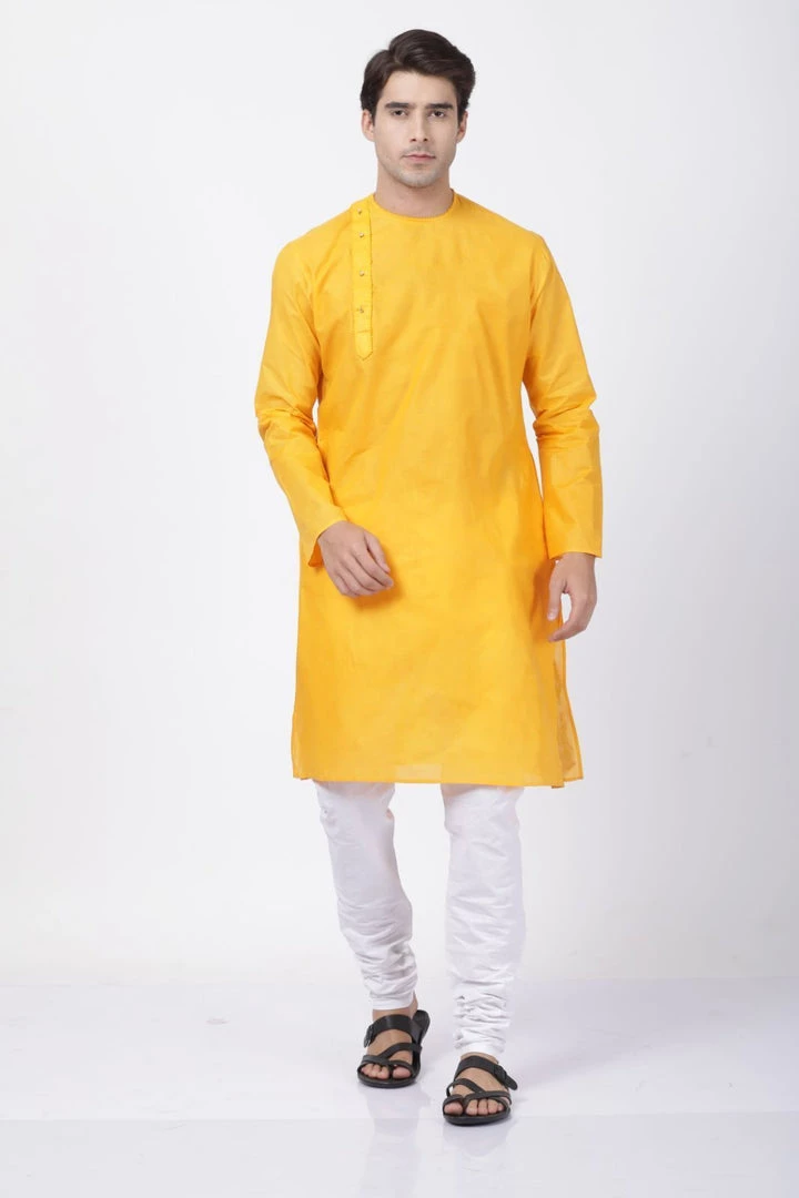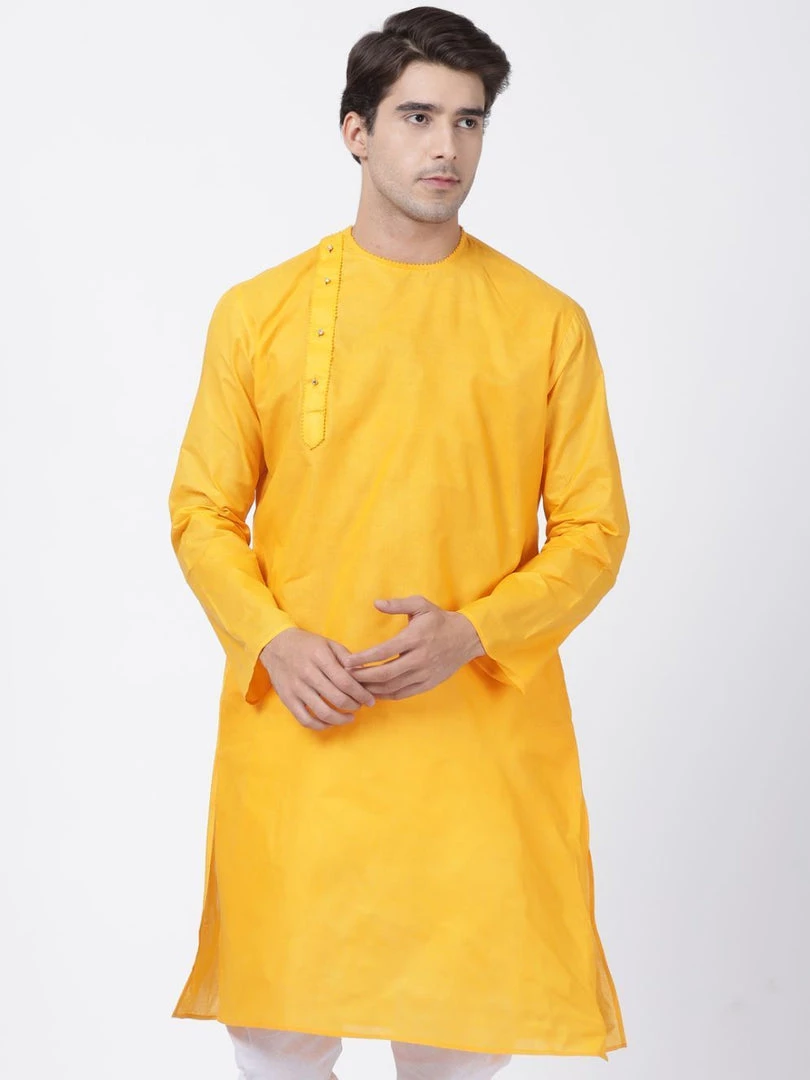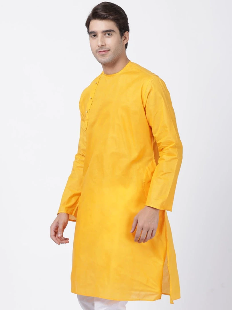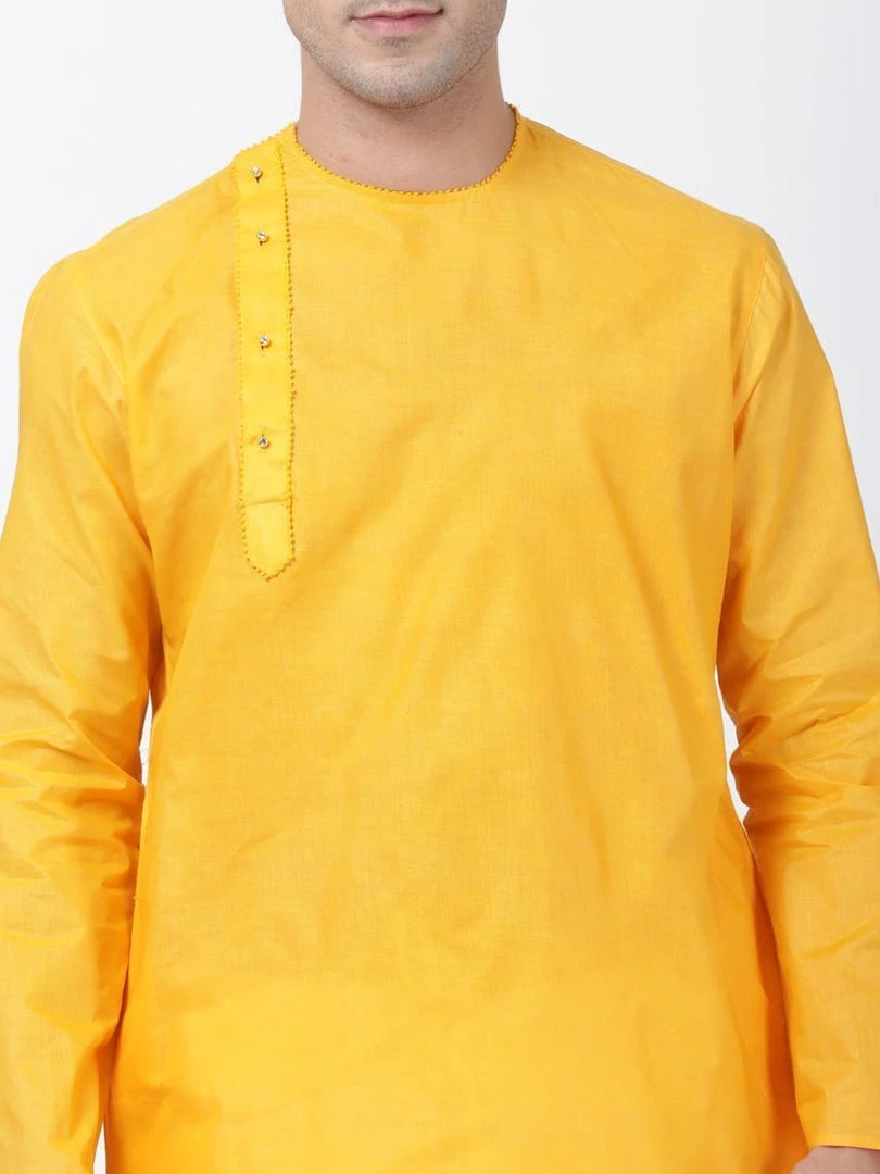 Yellow solid straight kurta, has a round neck, long sleeves, side button placket, straight hem, and side slits