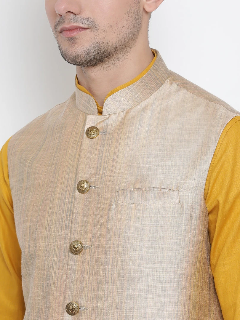 Gold toned woven Nehru jacket, has a mandarin collar, sleeveless, three pockets