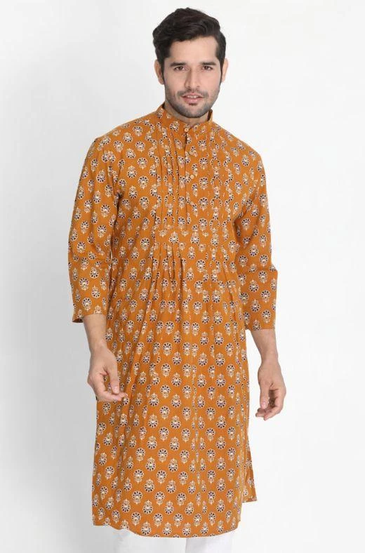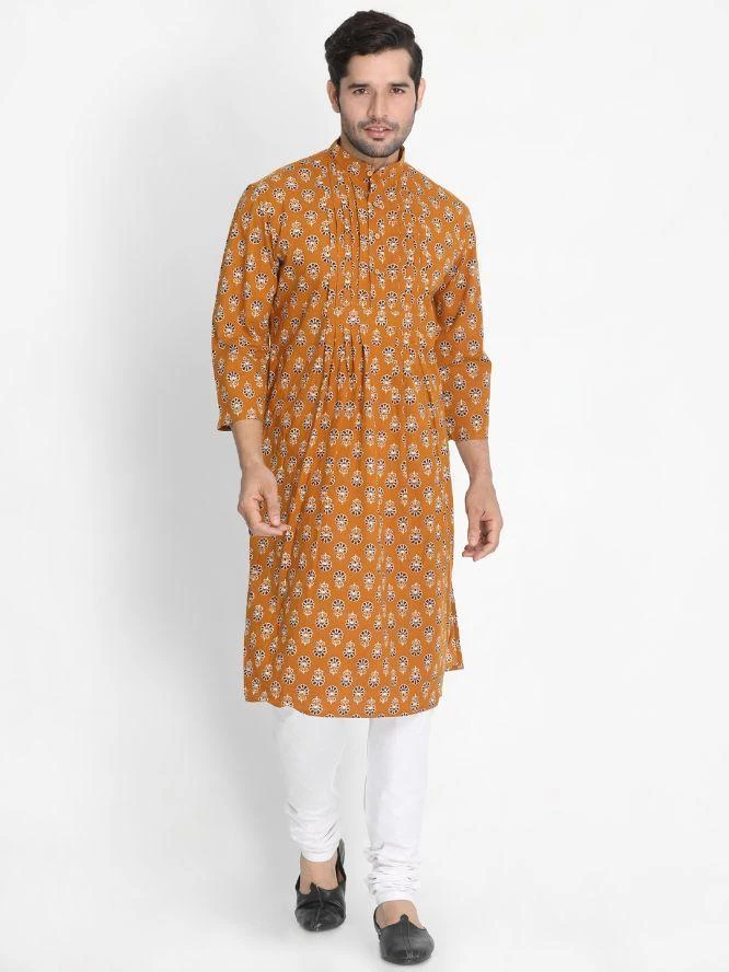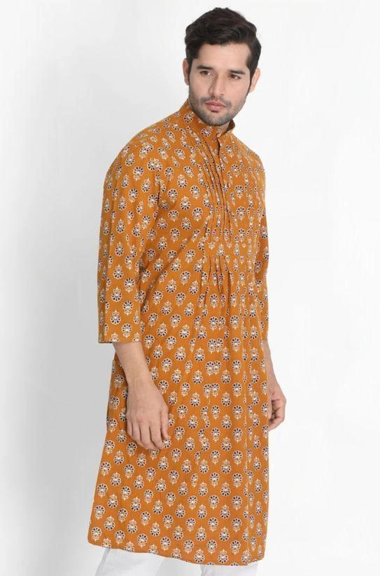Yellow printed straight pleated knee-length kurta, has a mandarin collar, button placket, long sleeves, straight hem