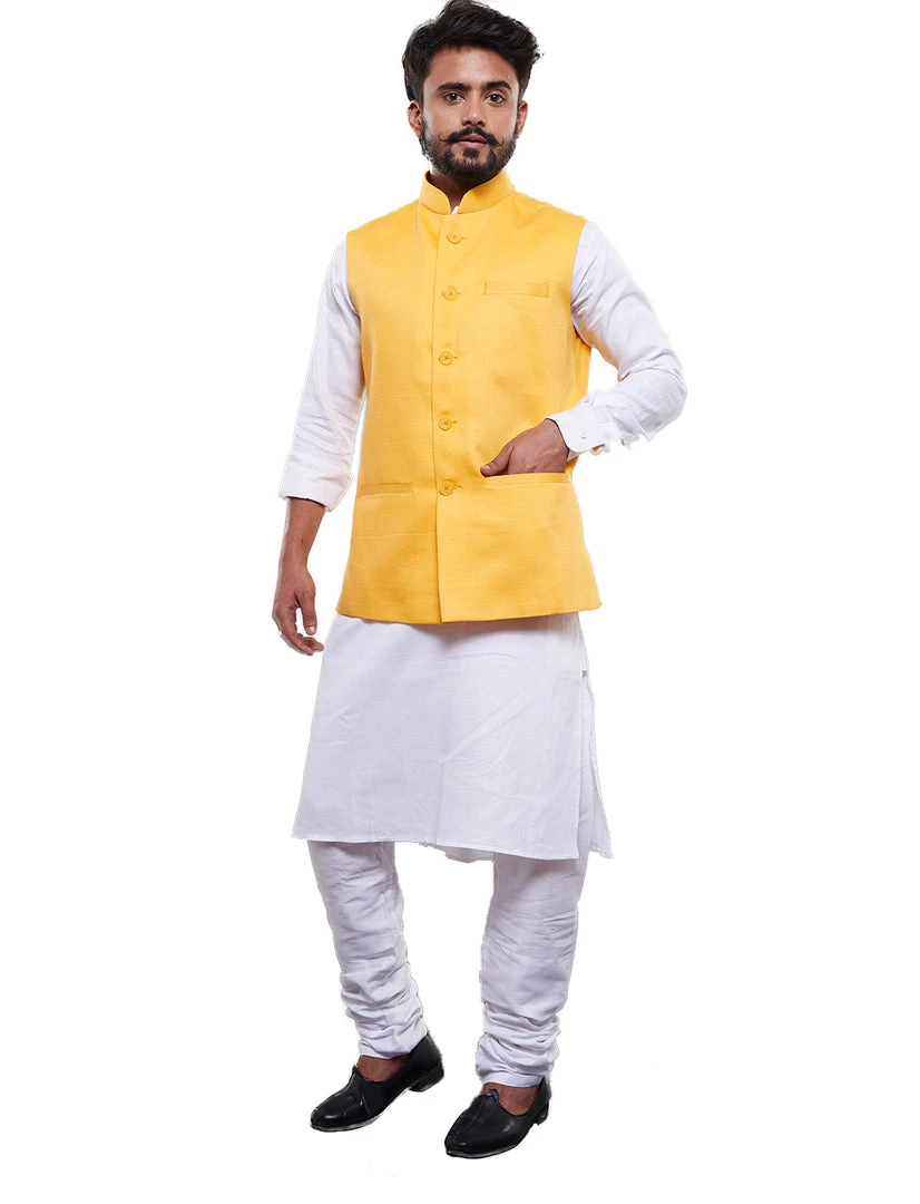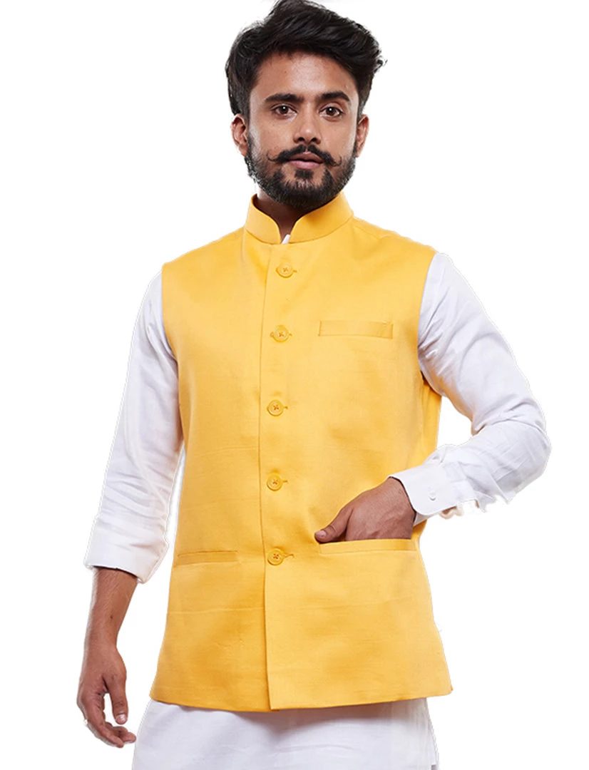 Yellow Solid Nehru Jacket, Regular style, Regular-length, has a Mandarin Collar, Sleeveless, Straight hem, and has three pockets