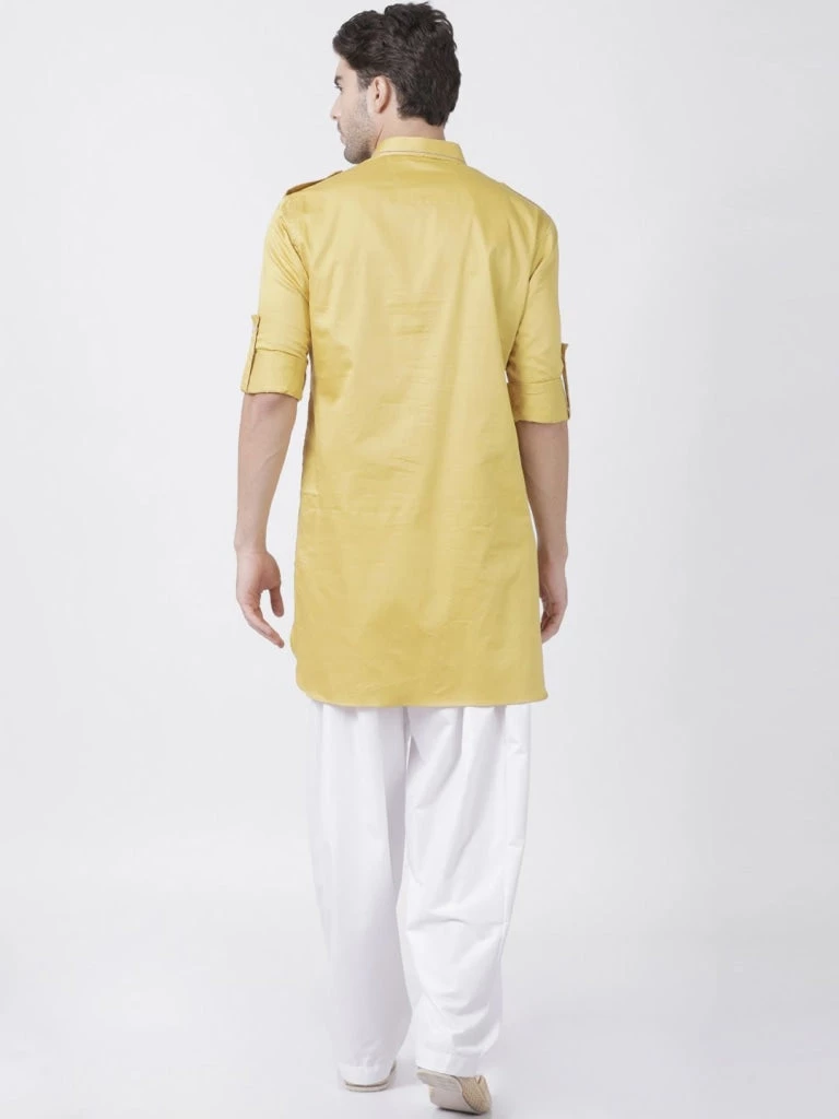 Yellow solid straight above knee length kurta, has a shirt collar, button placket, long sleeves, two pockets and curved hem