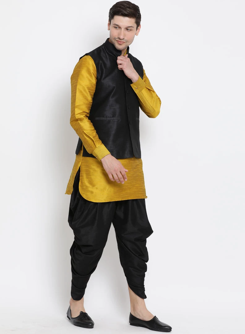 Yellow solid kurta with solid dhoti pant and black Nehru jacket