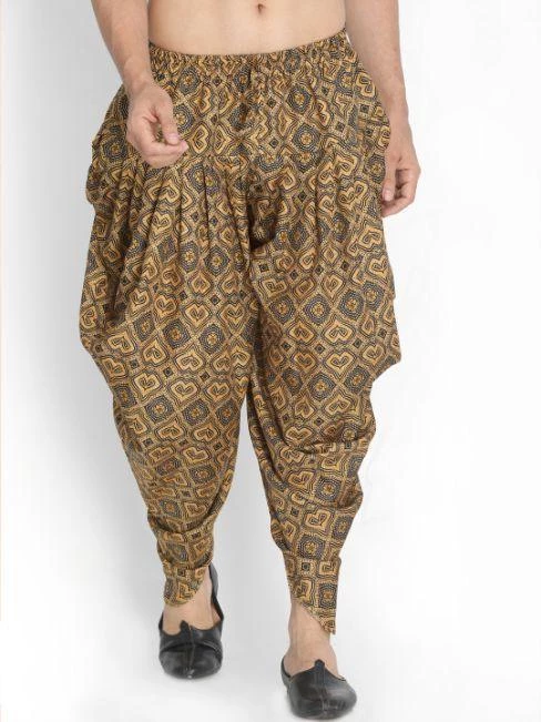 Mustard yellow and black printed dhoti pant with pleats forming cowl on sides, has an elasticated waistband with draw-string closure