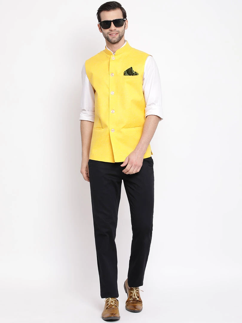 Yellow coloured solid design Nehru jacket has a mandarin collar, sleeveless, three pockets. Comes with a pocket square