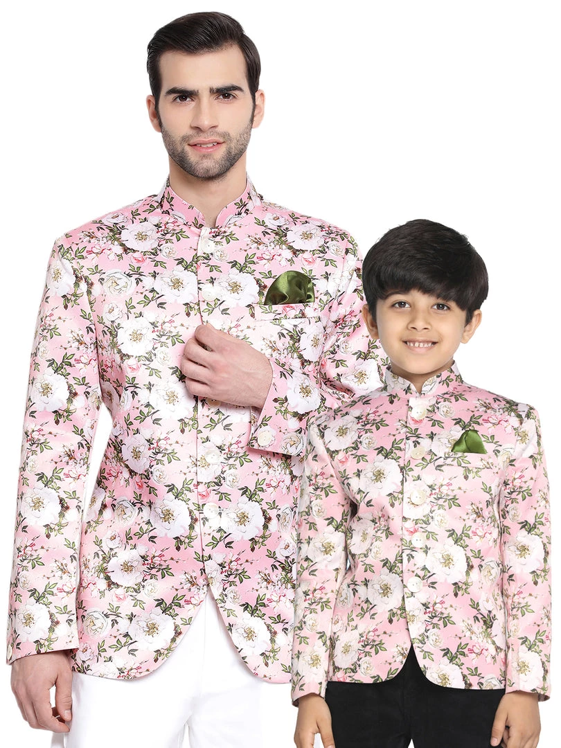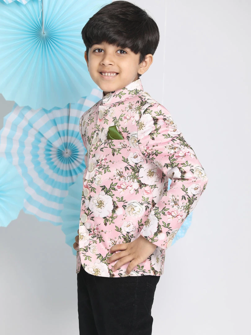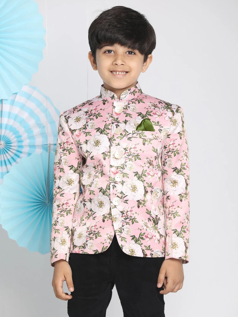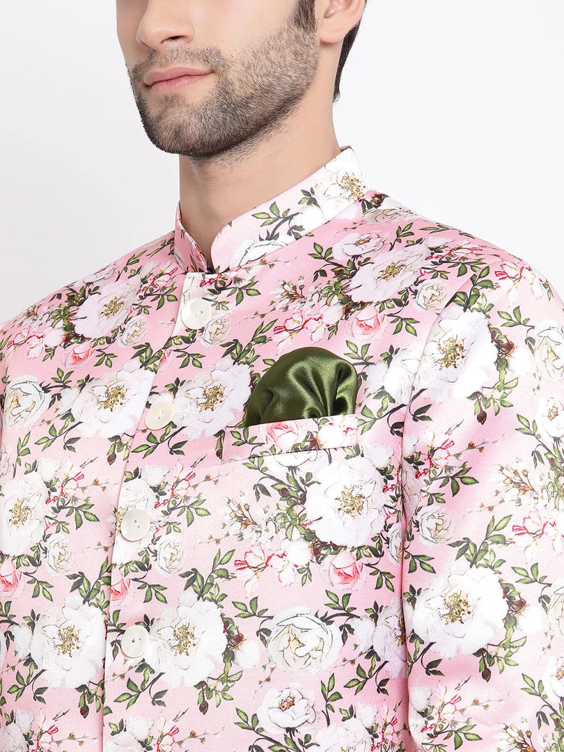 Multicolor-base-pink floral printed slim-fit jodhpuri jacket, has a mandarin collar, long sleeves, a full button placket, one pocket with pocket square, side slits and straight hem