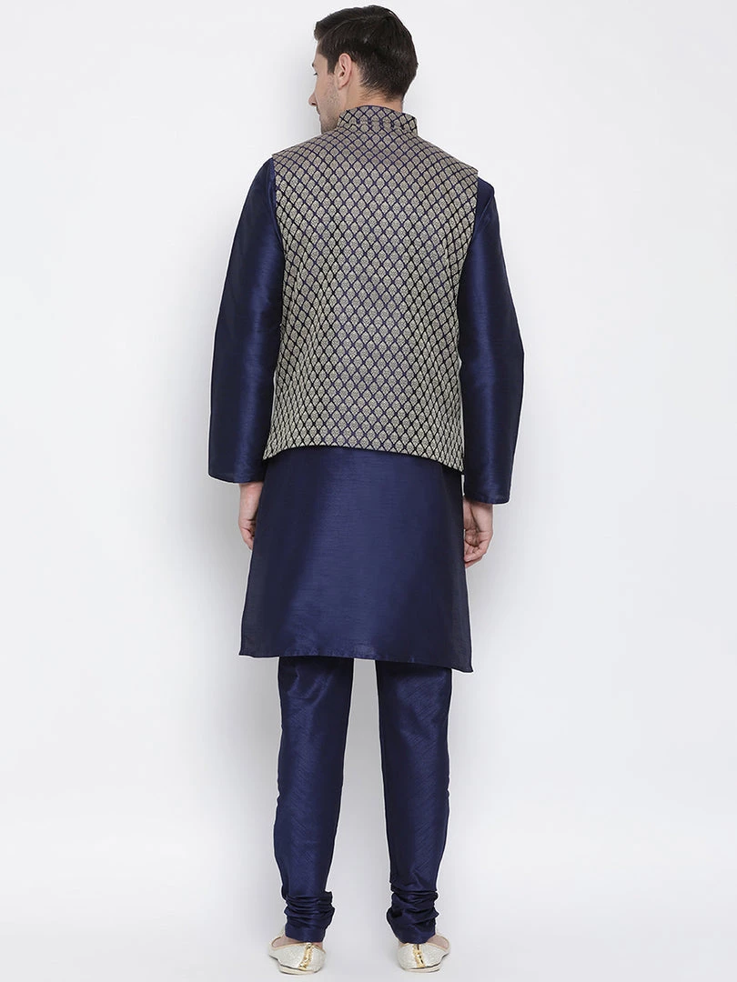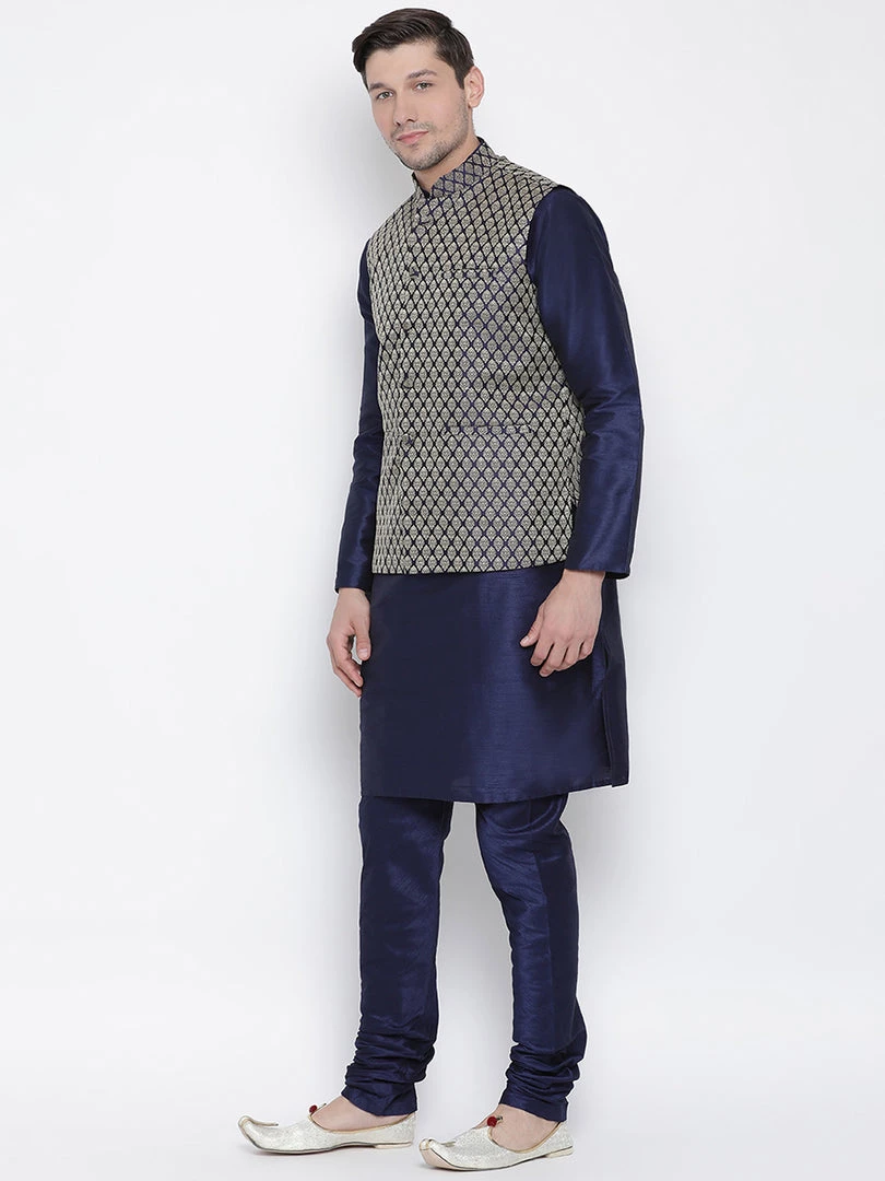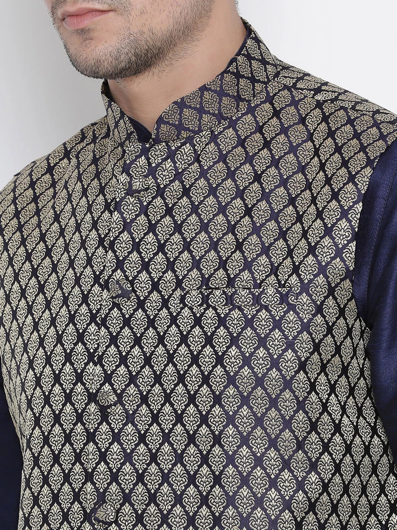 Navy blue and gold jacquard nehru jacket, sleeveless, has a mandarin collar, front button placket and welt pocket with pocket square.