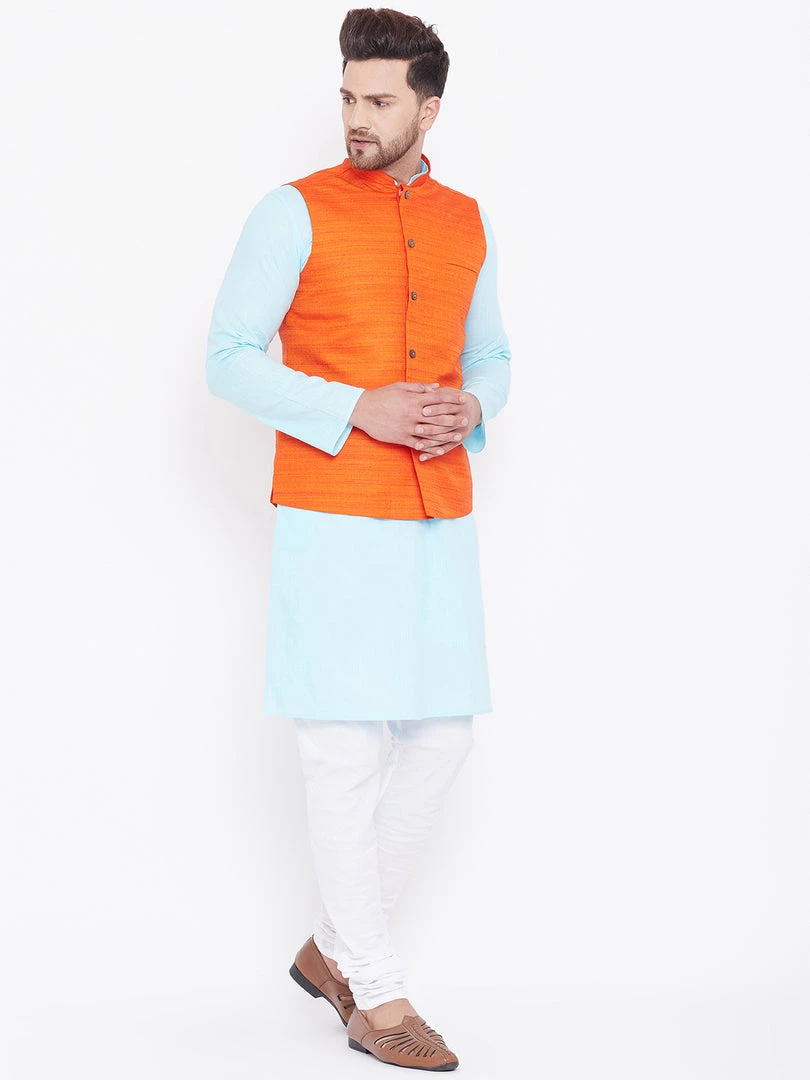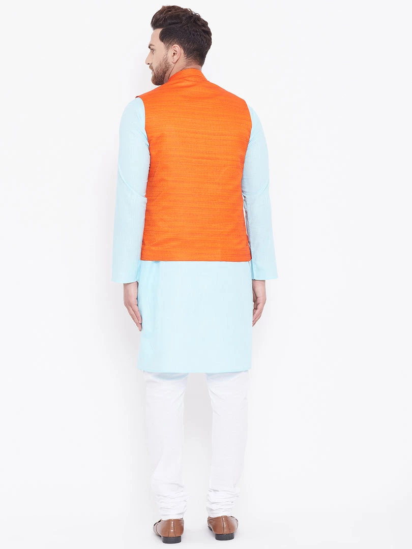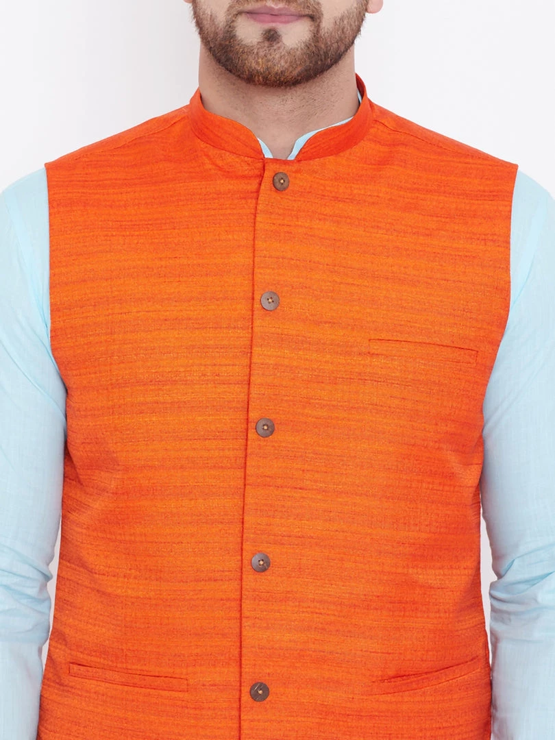 Orange woven Nehru jacket, Regular style, straight waist-length Nehru jacket, has a Mandarin collar, Sleeveless, Straight hem, and one pocket.
