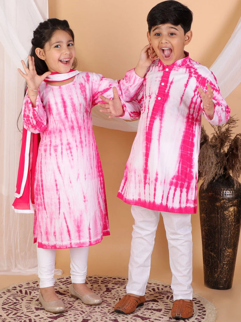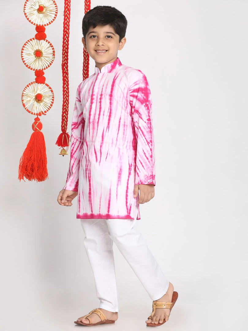 Pink and white tie dye straight cotton knee length kurta, has a mandarin collar, button placket, long sleeves, straight hem and side slits. Comes with white solid pyjama, has elasticated waistband.