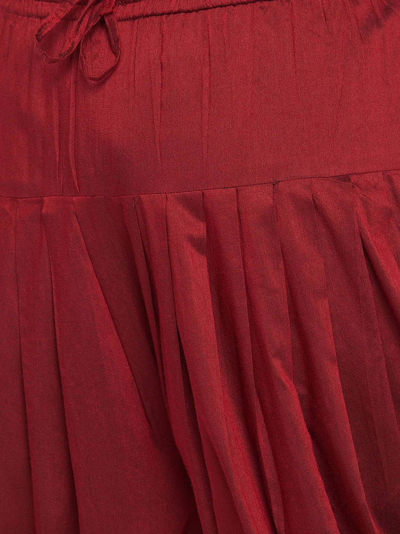 Maroon solid dhoti pant, has elasticated waistband and drawstring closure