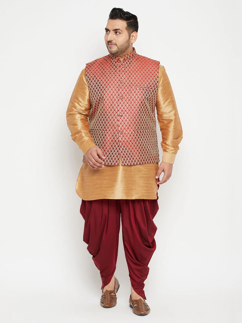 Rose gold solid kurta with solid dhoti pant and maroon Nehru jacket