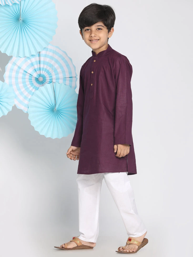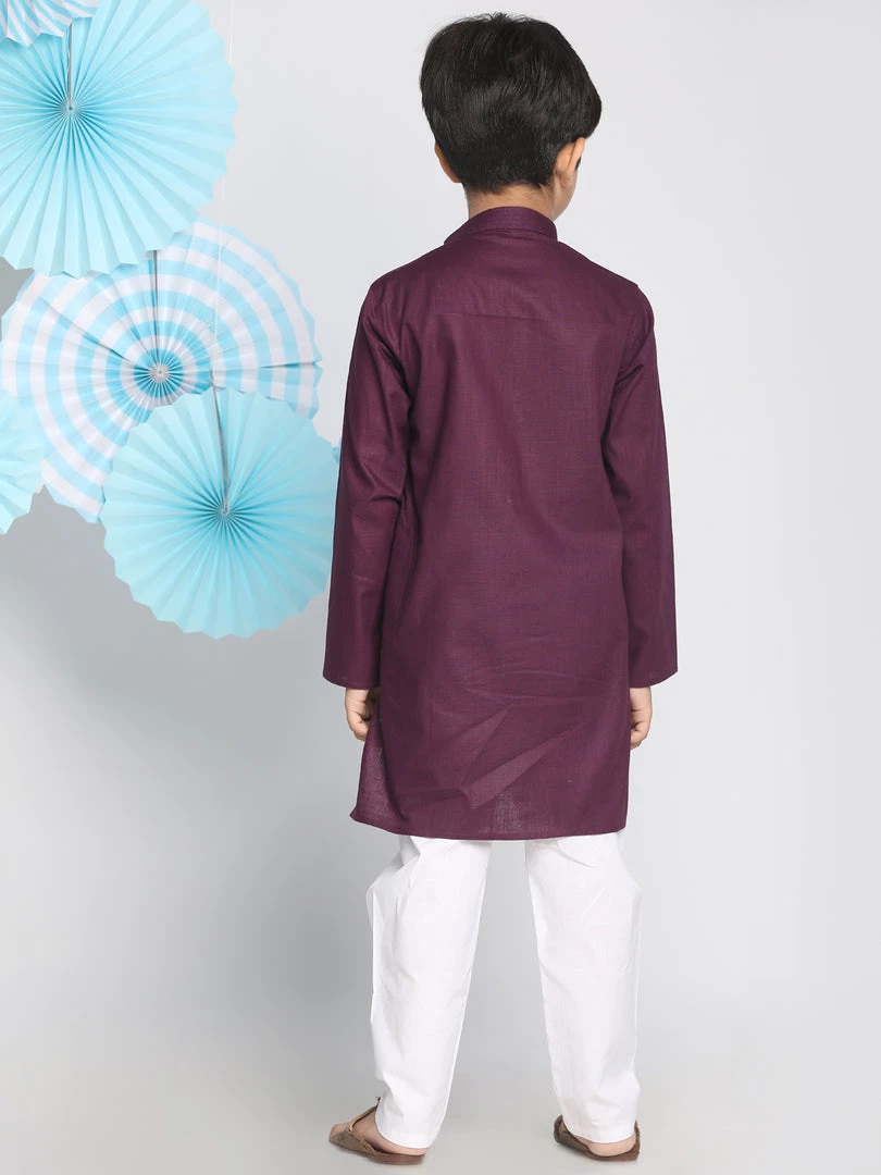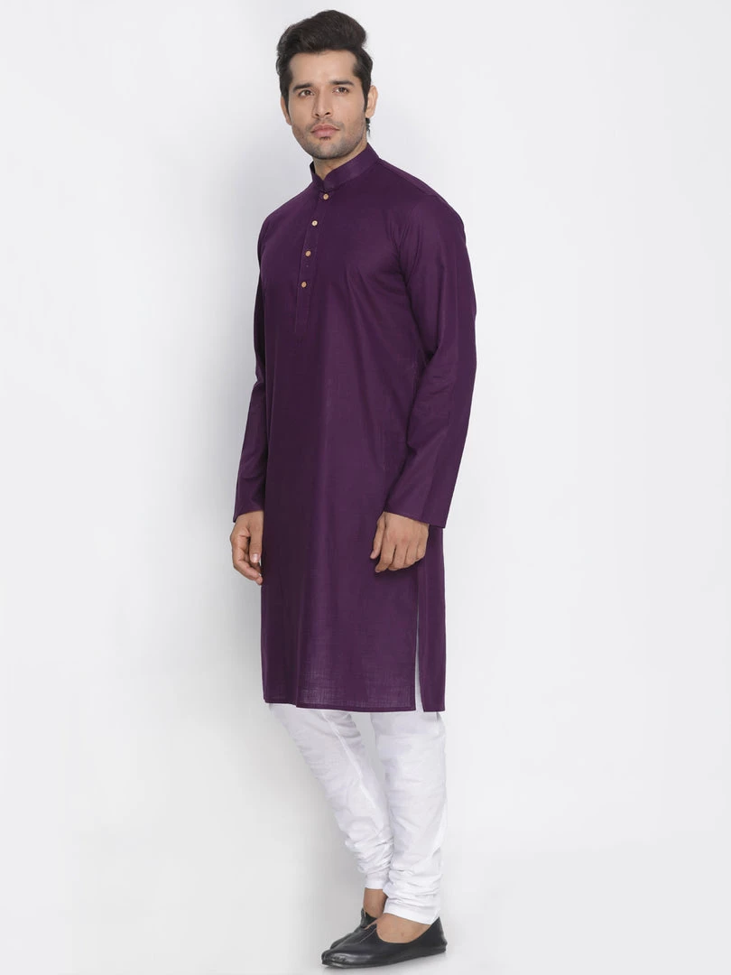 Purple straight solid knee-length kurta, has a mandarin collar, long sleeves, straight hem, button placket, side slits