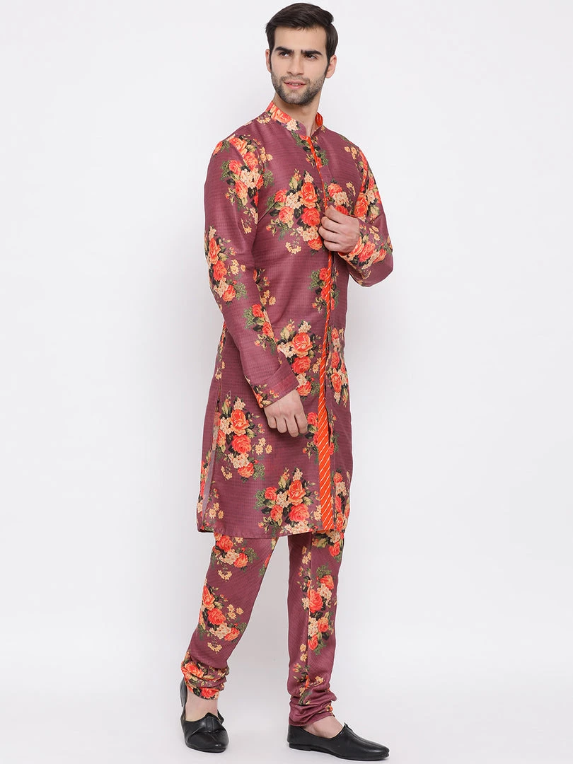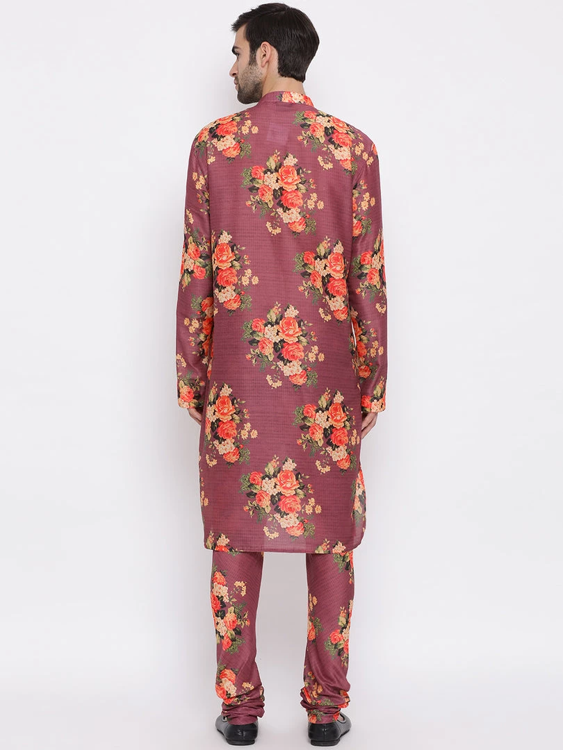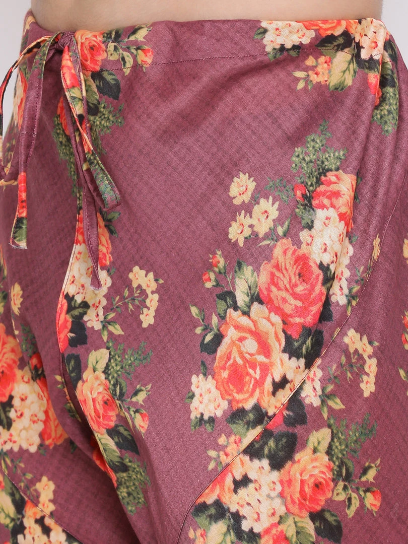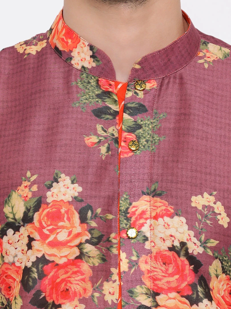 Purple floral printed straight knee length kurta, has a mandarin collar, leharia border, long sleeves, full front button placket, straight hem.