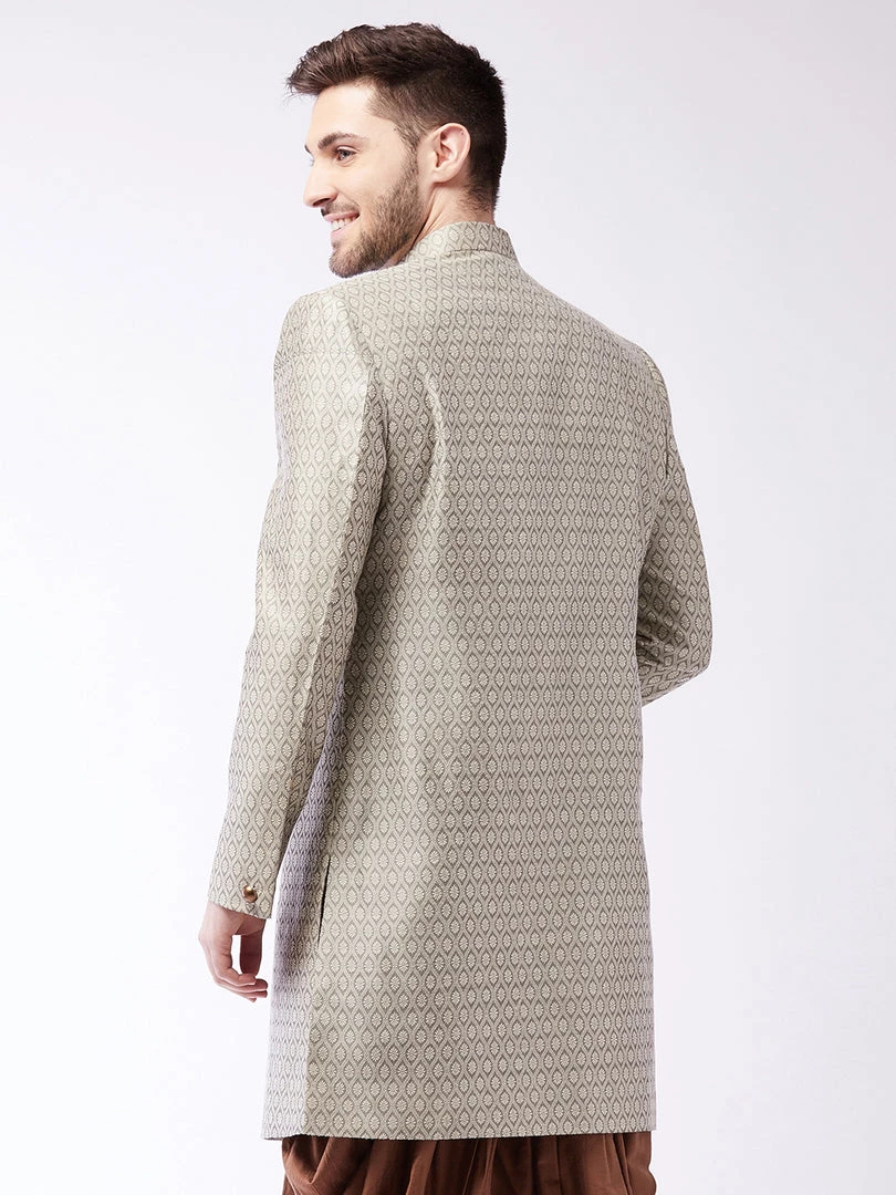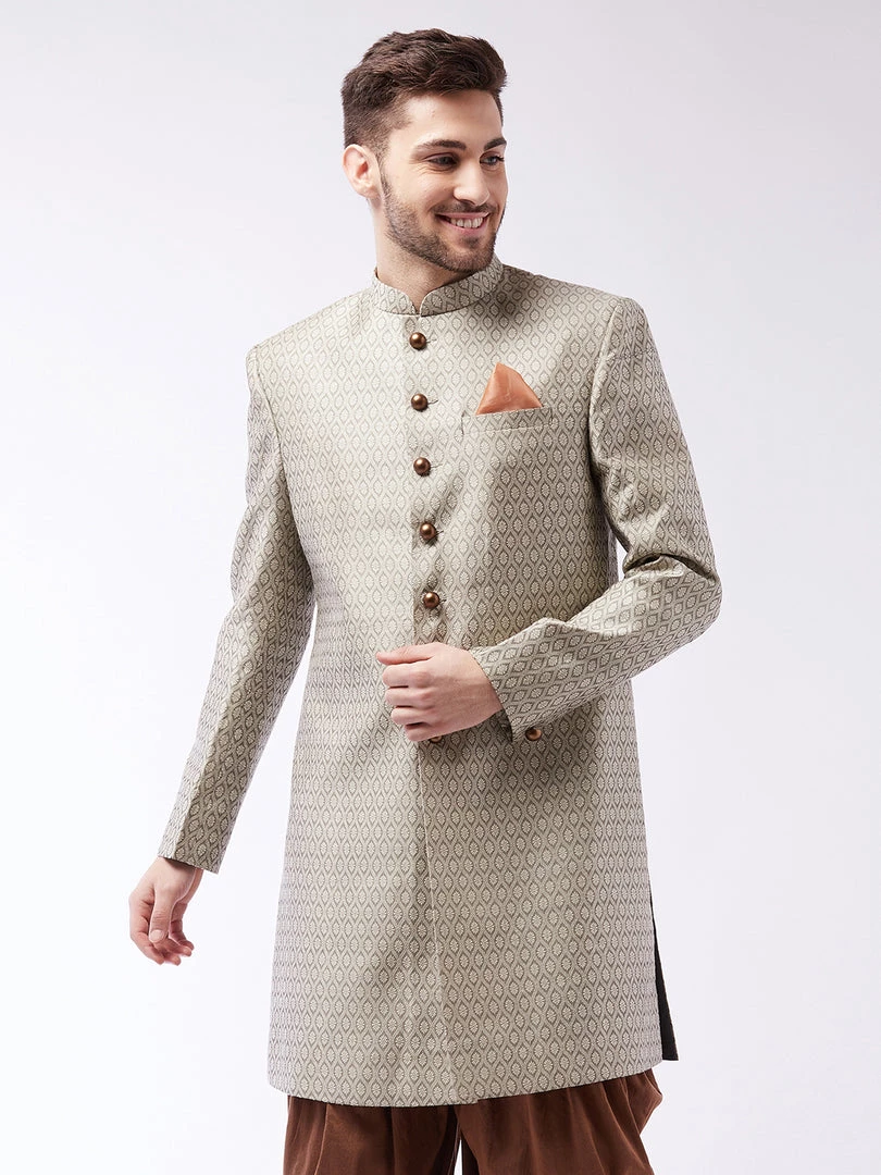 Woven Banarasi jacquard sherwani, has a mandarin collar, long sleeves, full button placket, straight hemline, side slits, two side pockets, and one welt pocket.