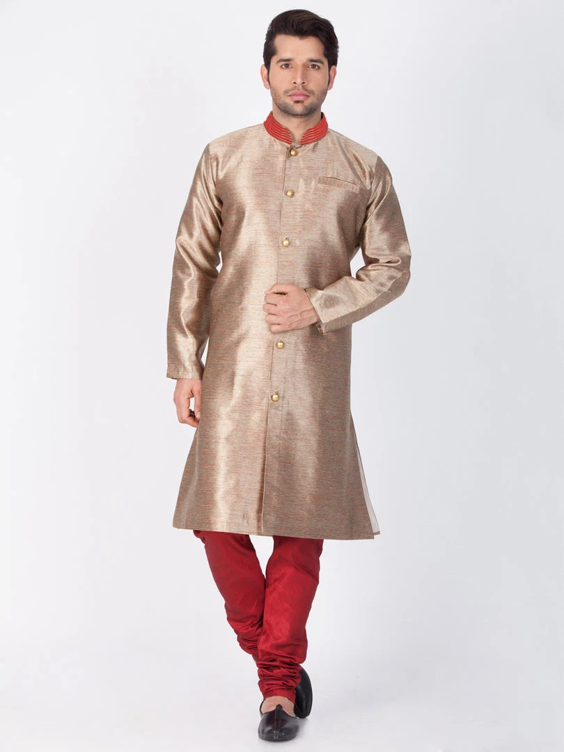 Golden knee length sherwani, has a mandarin collar, long sleeves, full front button placket, straight hem, side slits and a welt pocket