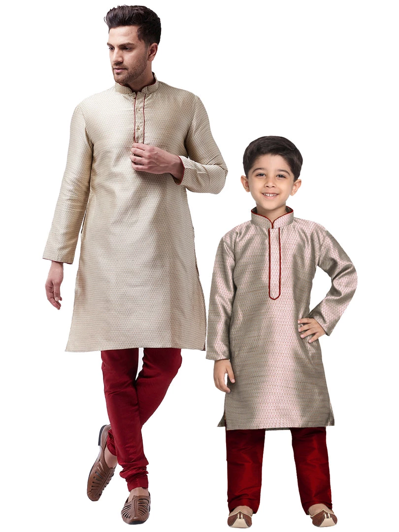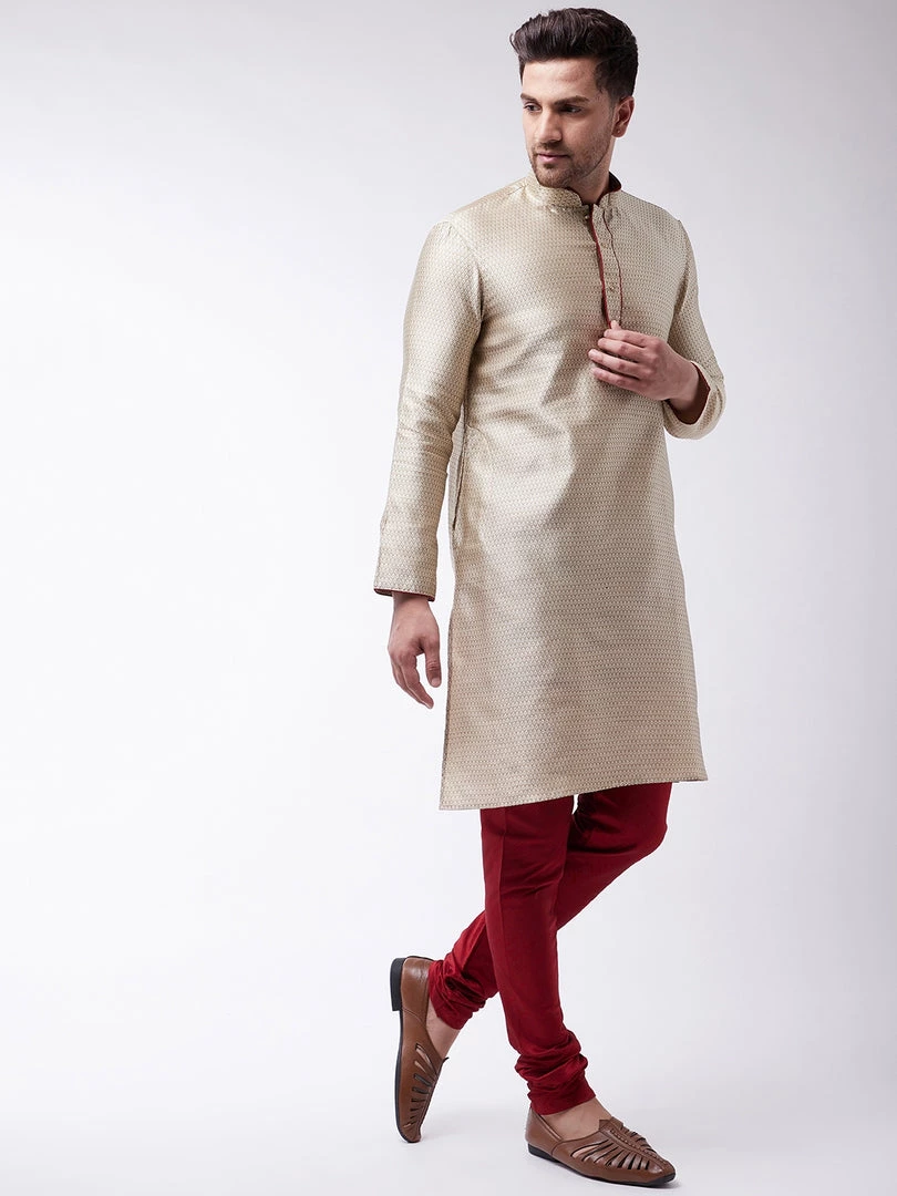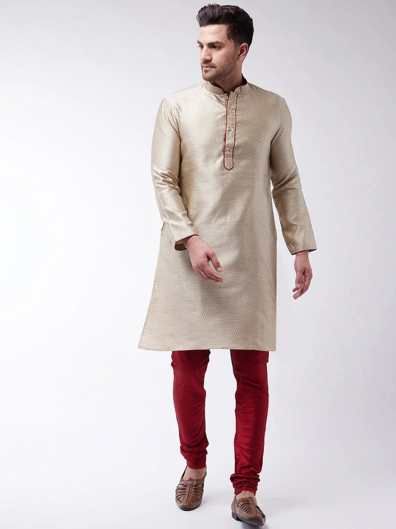 Beige woven design banarasi jacquard straight knee-length kurta, has a mandarin collar, maroon piping detailing, button placket, long sleeves, a straight hem, and side slits. Comes with a maroon churidar, has a drawstring closure.