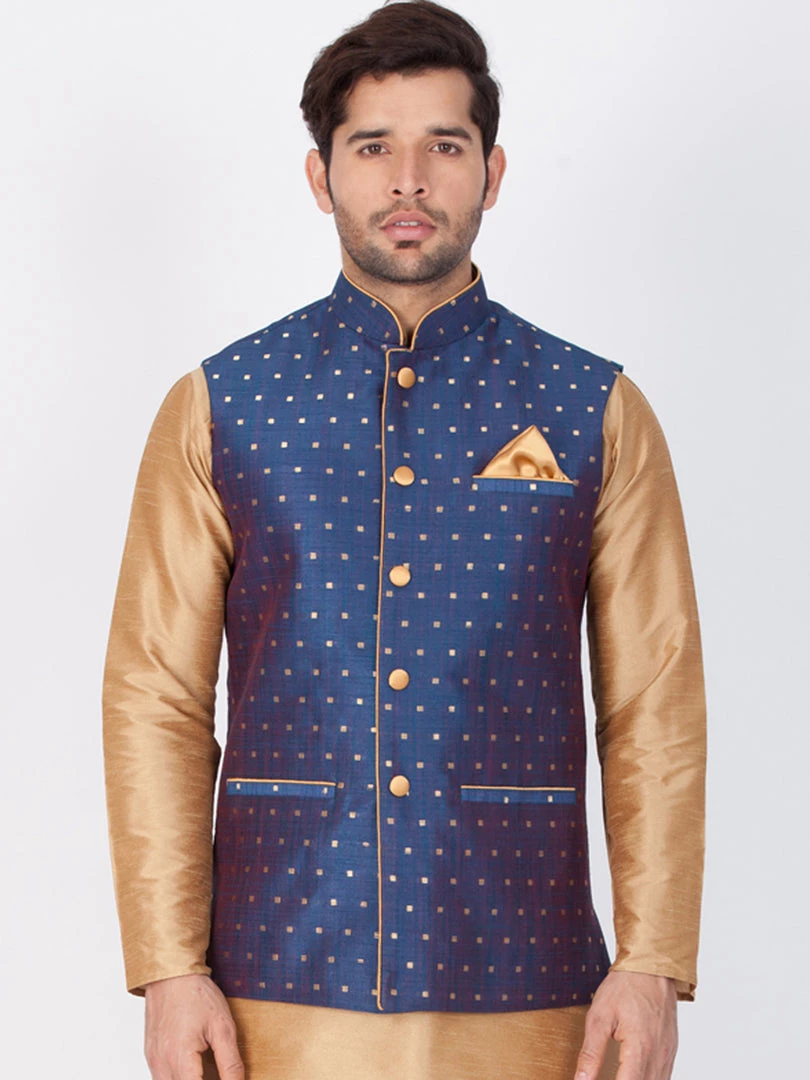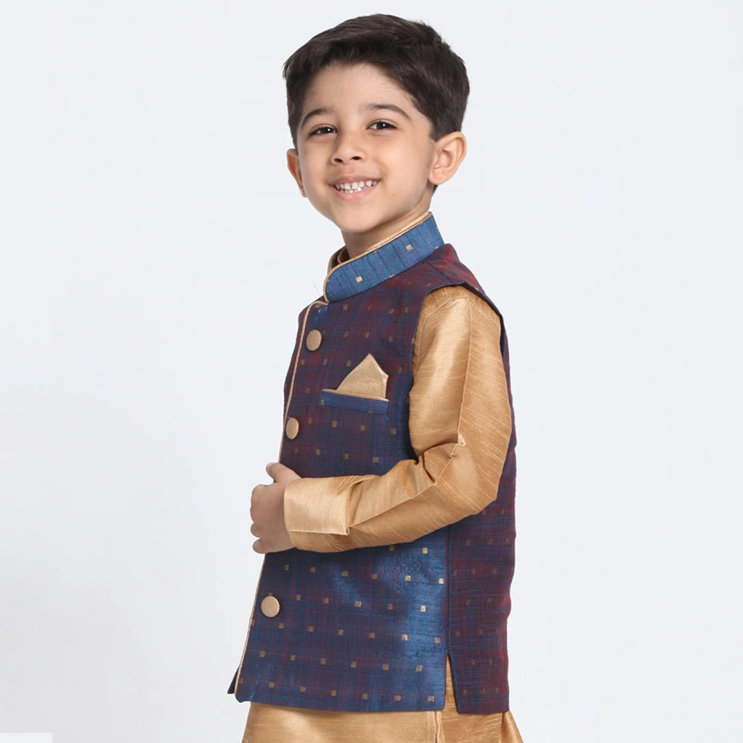 Banarasi Brocade Woven Jacquard Modi/Nehru Jacket in a two-tone mulberry fabric that has a nice ribbed effect with Zari threads running in a checkered manner, has a Mandarin collar, straight waist-length, Sleeveless, Straight hem, and three pockets with a pocket square,