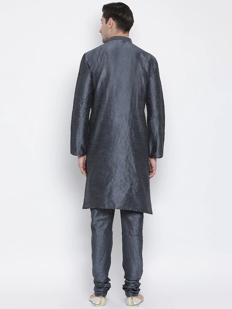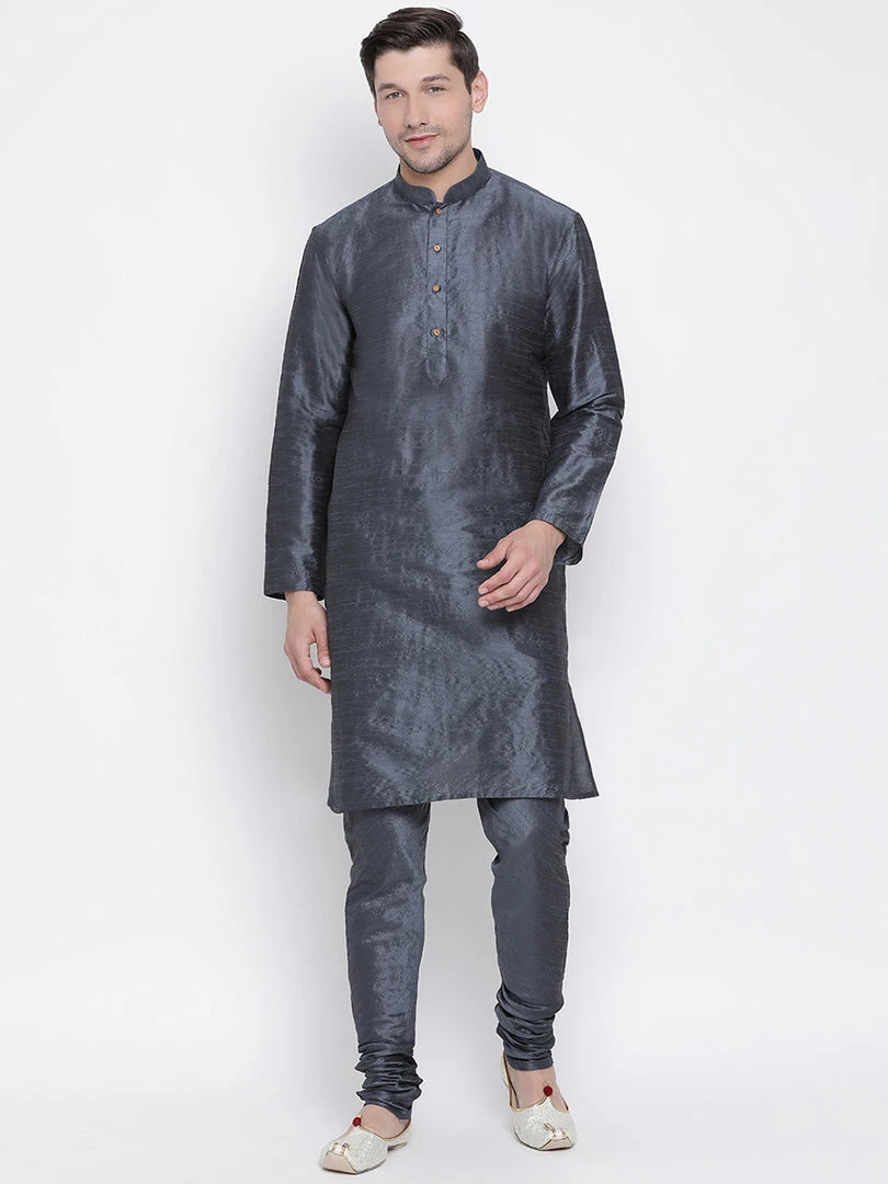 Banarasi silk with a slight cotton mix for a soft comfortable feel solid straight knee-length kurta, has a mandarin collar, button placket, long sleeves, straight hem. Comes with a grey color solid churidar, drawstring, and elasticated waistband