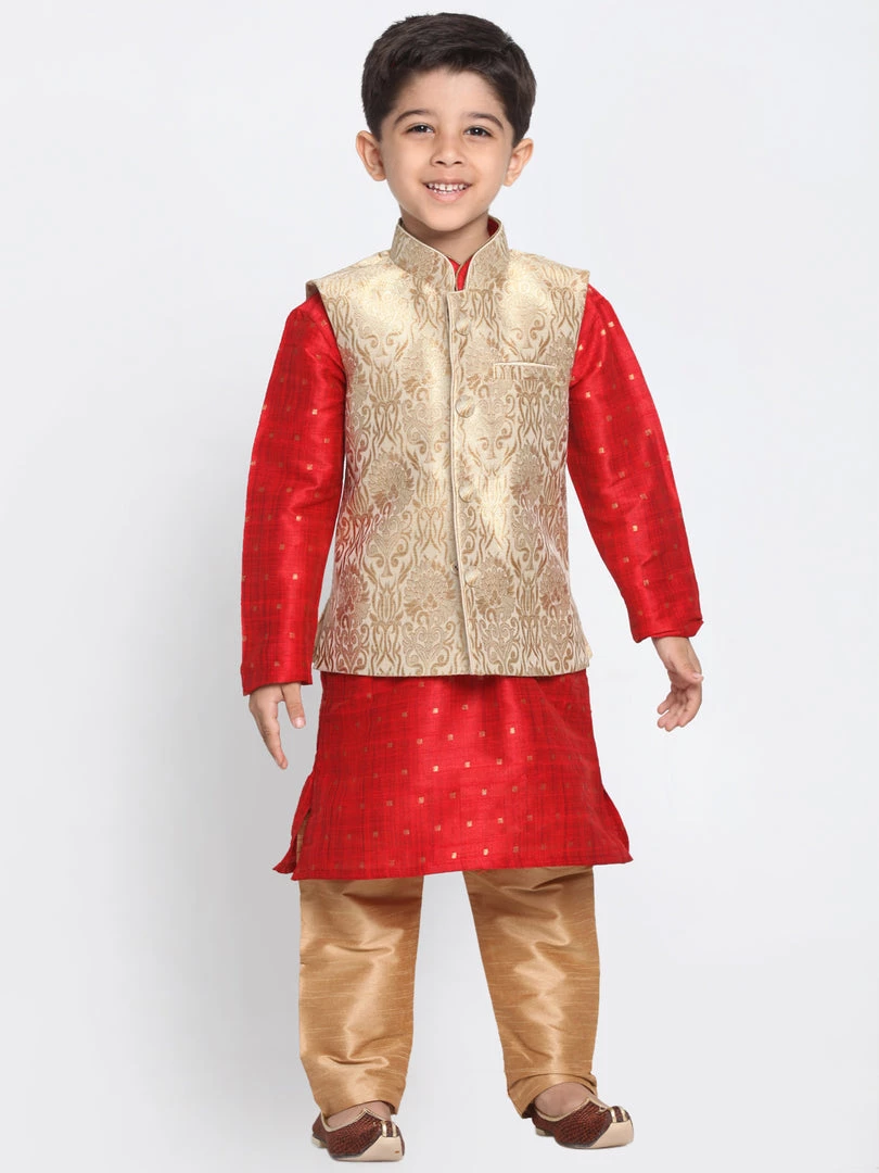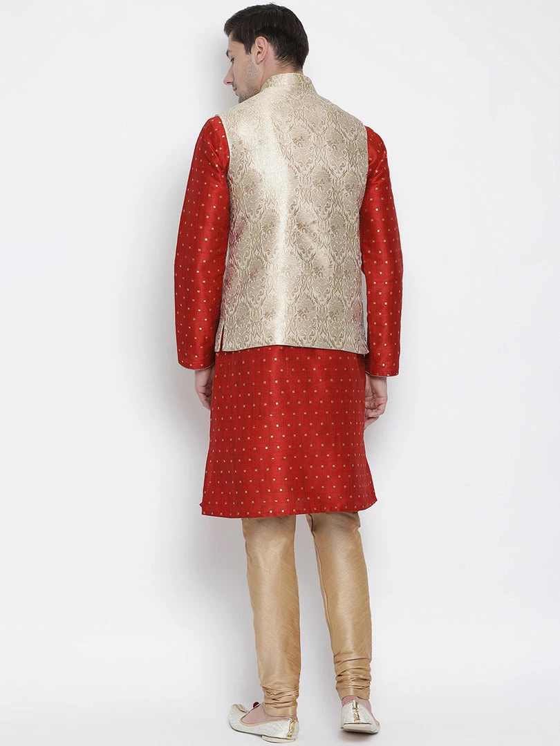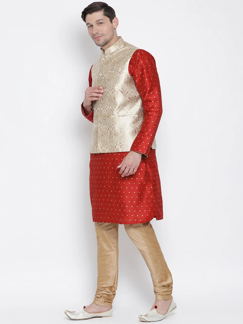 Banarasi Brocade Woven Jaquard Modi/Nehru Jacket and Silk Kurta Pyjama Set. The kurta is a two-tone mulberry fabric that has a nice ribbed effect with Zari threads running in a checkered manner.