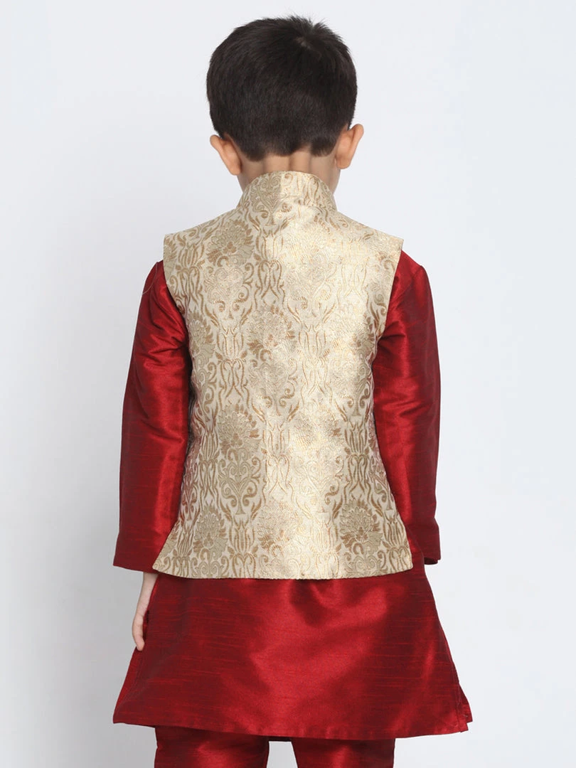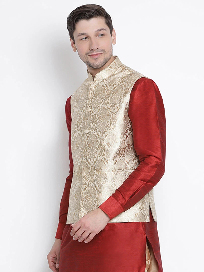 Rose Gold Banarasi Brocade Woven Jacquard Nehru Jacket, straight waist-length, has a Mandarin collar, Sleeveless, Straight hem, and one pocket.