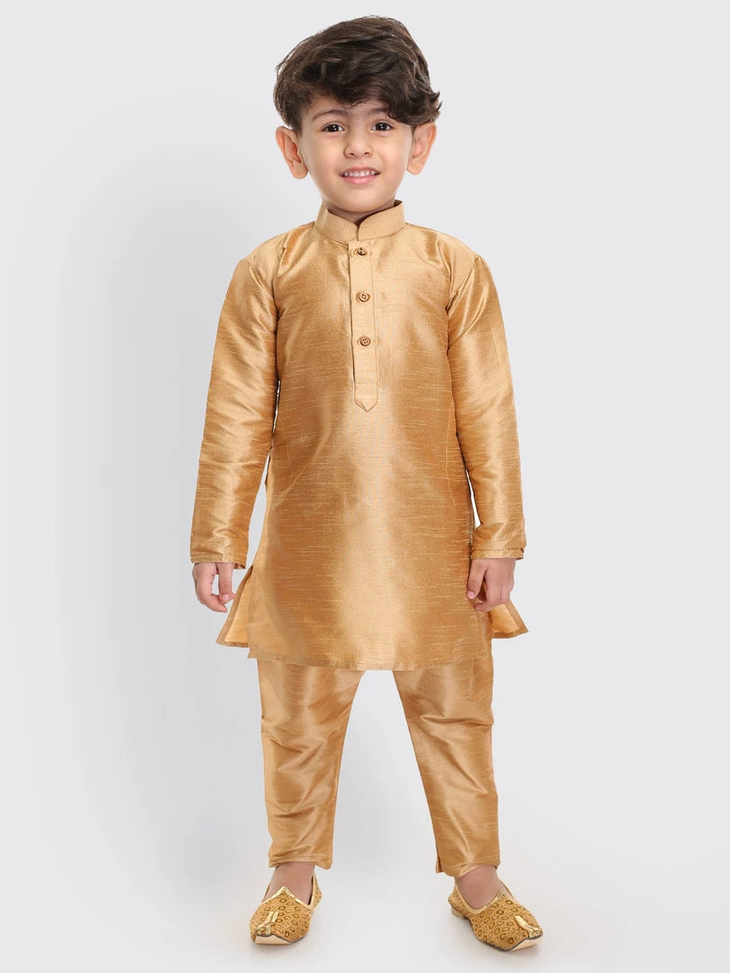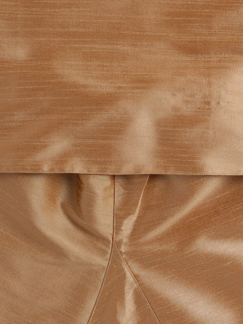Rose gold banarasi silk with a slight cotton mix for a soft comfortable feel solid straight knee-length kurta, has a mandarin collar, button placket, long sleeves, straight hem