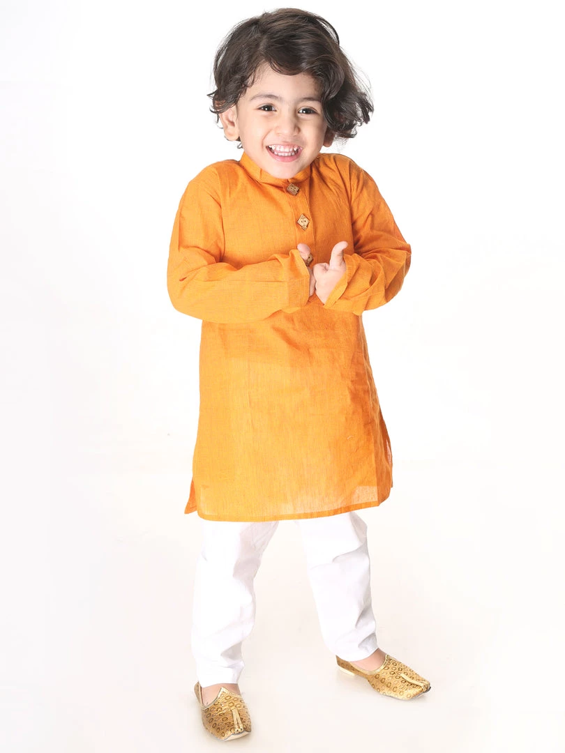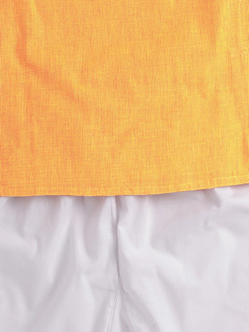 Yellow pure south handloom cotton straight woven stripe knee-length kurta, has a mandarin collar, long sleeves, straight hem, placket with kite shape wooden button, side slits
