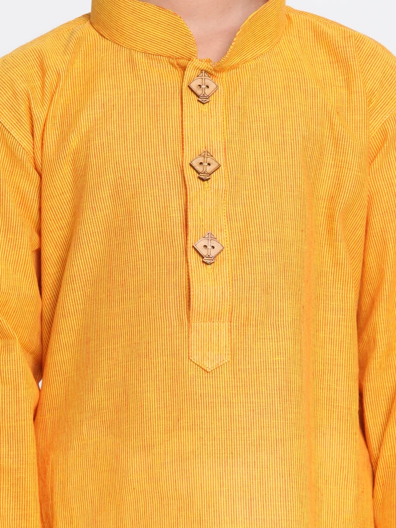 Yellow straight knee-length kurta, has a mandarin collar, long sleeves, straight hem, side slits. We have ornamented the kurta by adding subtle wooden kite shape buttons which also adds a bit of fun part for your little one to love it more! Comes with a Pyjama on an elasticated waistband.