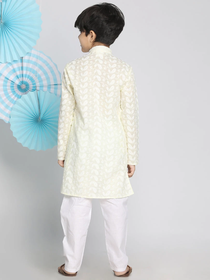 Cotton kurta pyjama set in self design all over Lukhnowi chikankari embroidery, has full sleeves, mandarin collar, button closure and comes with cotton relaxed pyjama.